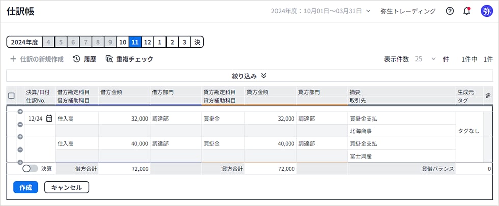 日付や科目、金額などを入力します。借方合計と貸方合計が一致するように入力してください。入力が終わったら「作成」ボタンをクリックします。