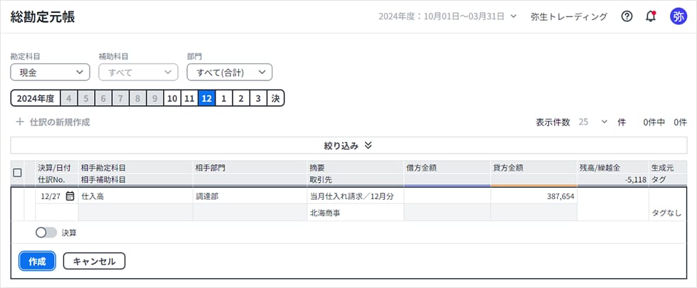 [仕訳帳]と同様に、仕訳の作成や編集、削除ができます。