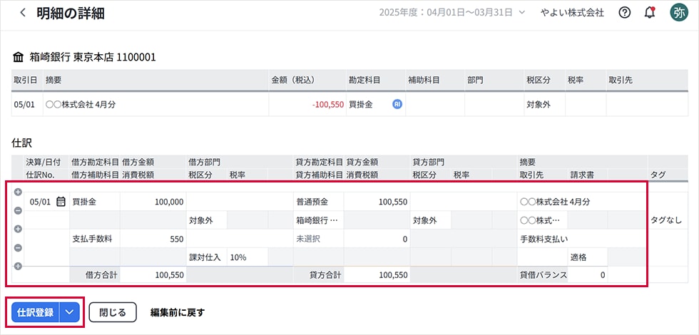 編集後、「仕訳登録」をクリックすると、編集後の内容で仕訳帳に登録できます。