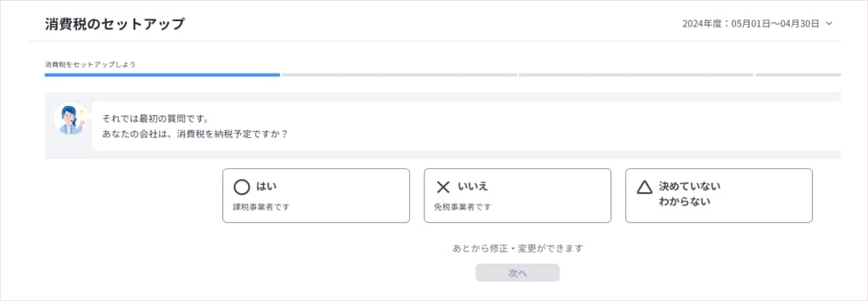 初期セットアップの「消費税を設定しよう」から、消費税(課税/免税)の設定を行います。