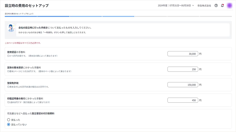 初期セットアップの「設立時の費用を設定しよう」から、設立時の費用の設定を行います。