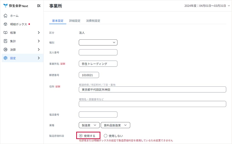 製造業で製造原価報告書を作成する方は、設定メニューから事業所画面を開き、製造原価科目欄で「使用する」にチェックをつけます。