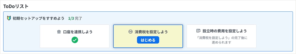 口座の連携、消費税の設定、設立時の費用の設定の3項目あります。