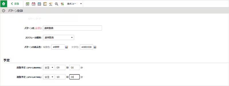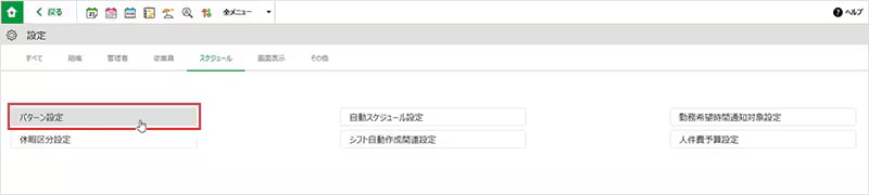 「スケジュールパターン」とは、出勤・退勤予定や休憩時間などのスケジュールをあらかじめパターン化する機能です。パターンを設定することで、スケジュール登録作業を効率化できます。