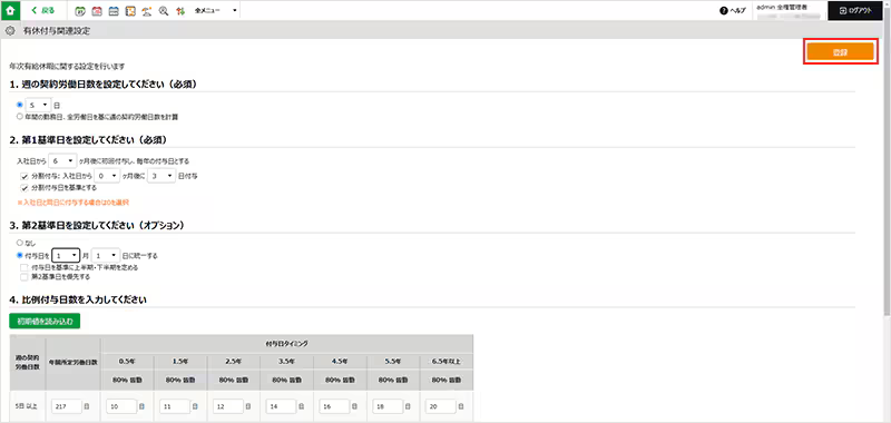 各項目で 付与日数 や 付与基準日 を設定し、登録 をクリックします