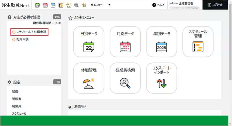 ホーム画面の左にある「対応が必要な処理」から「スケジュール/休暇申請」をクリックします。