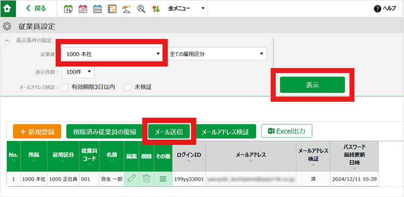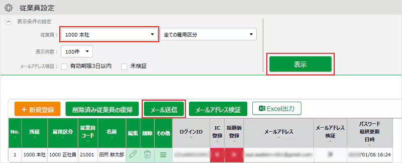 ホーム画面から、設定 ▶ 従業員 ▶ 従業員設定に遷移後、所属を1つ選択し[表示]をクリックすると、[メール送信]ボタンが表示されますので、これをクリックします。