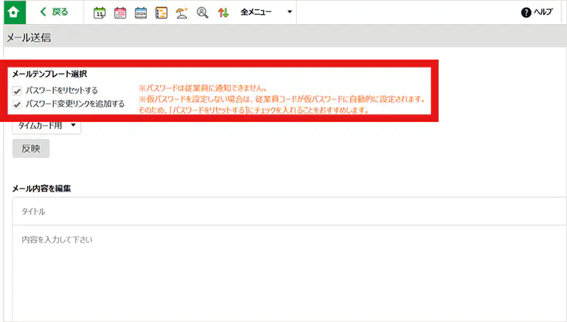 メールテンプレートにて「パスワードをリセットする」「パスワード変更リンクを追加する」の両方をチェックし、