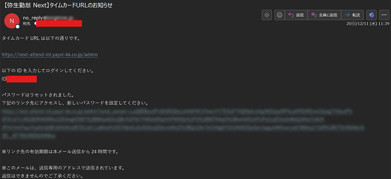 従業員は、「タイムカードURLのお知らせ」というメールを受領後、パスワード変更リンクをクリックし、パスワード変更画面にて、パスワードを入力します。