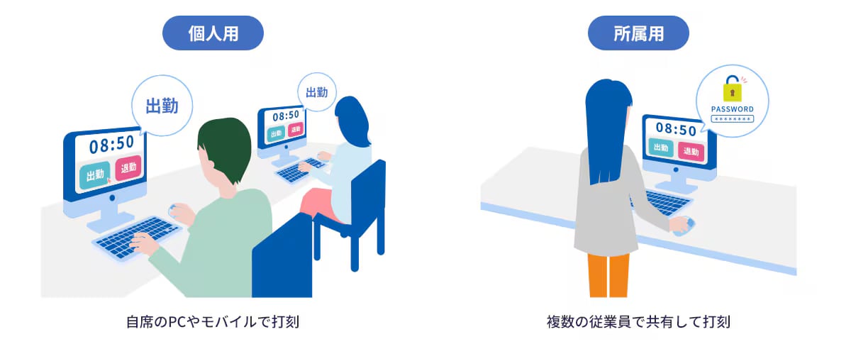 タイムレコーダーには「個人用」と「所属用」があり、それぞれ操作箇所が異なります。