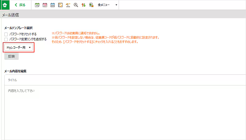メールテンプレートにて「Myレコーダー用」を選び、[反映]をクリックします。