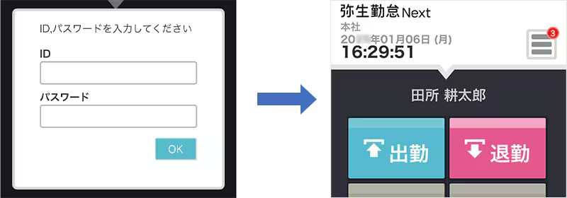 | Myレコーダー | ブラウザでの クリック認証 | スマートフォンやPCのブラウザでタイムレコーダー画面にログインします。 |
