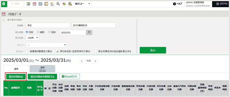 月別データ ▶ 勤怠を締めるをクリックしてください。