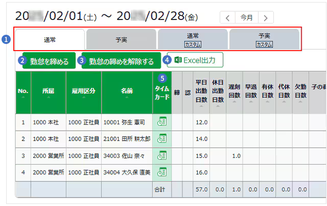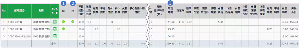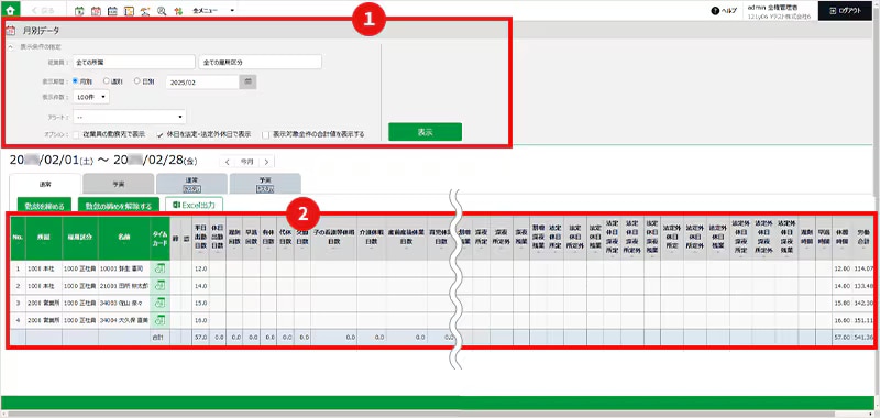 「月別データ」では、月別の出勤日数や休暇取得数、労働時間などの集計データを確認できます。