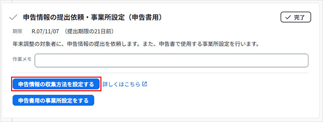 やることリストにある「申告情報の提出依頼・事業所設定(申告書用)」で[申告情報の収集方法を設定する]をクリックします。