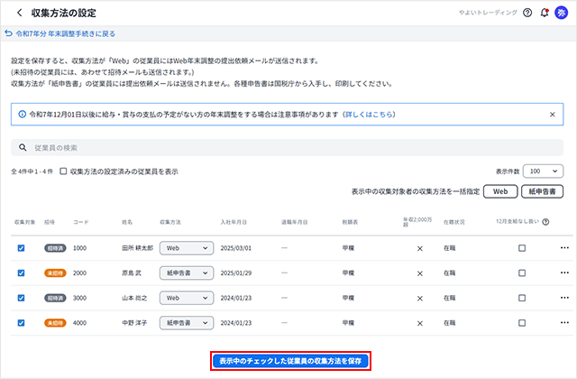 従業員から申告情報を収集する方法を「Web」「紙申告書」のいずれかから設定します。