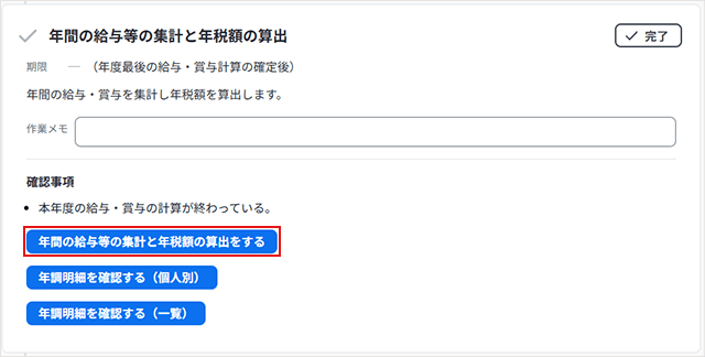 本年最後の給与または賞与が確定したらやることリストにある「年間の給与等の集計と年税額の算出」から[年間の給与等の集計と年税額の算出をする]をクリックします。