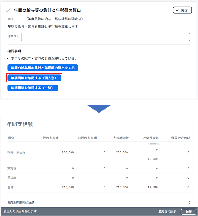 算出した金額を確認するため、[年調明細を確認する(個人別)]をクリックします。