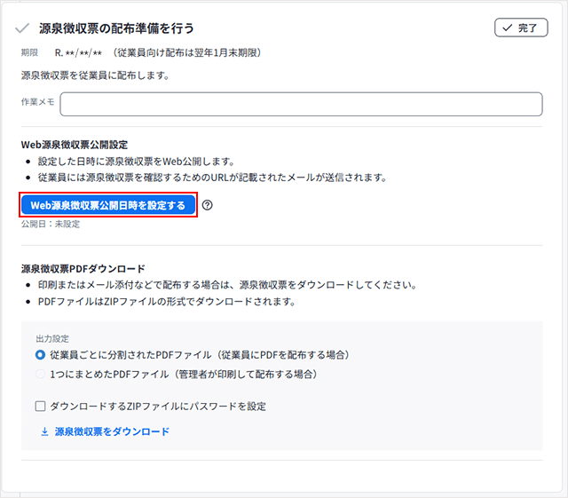 やることリストの「源泉徴収票の配布準備を行う」を表示し、「Web源泉徴収票公開設定」で[Web源泉徴収票公開日時を設定する]をクリックします。
