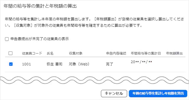 対象の従業員にチェックをつけて[年間の給与等を集計し年税額を算出]をクリックします。