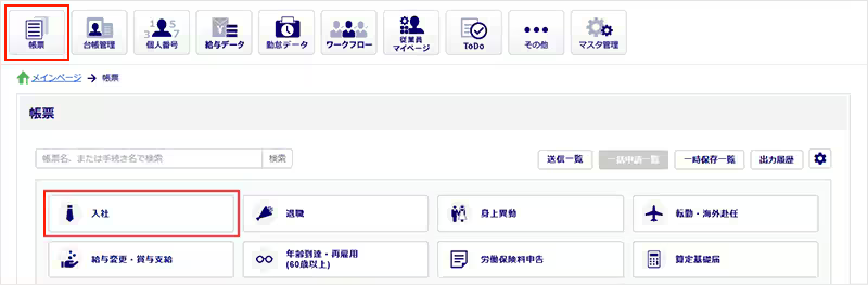 [帳票]▶[入社]をクリックします。