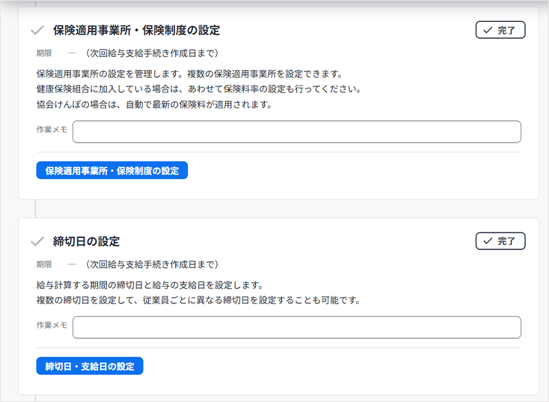 「保険適用事業所・保険制度の設定」、「締切日の設定」を行います。