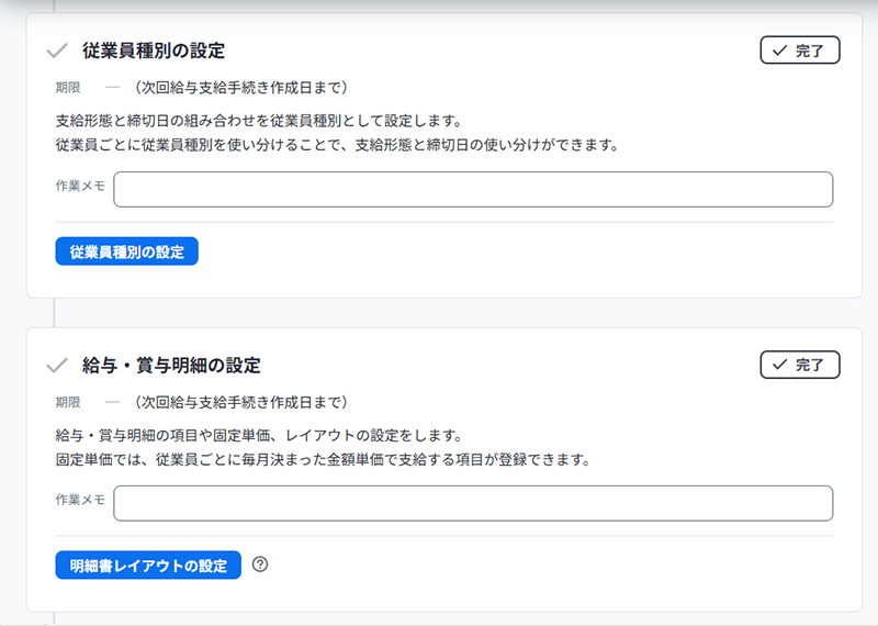 「従業員種別の設定」、「給与・賞与明細の設定」を行います。