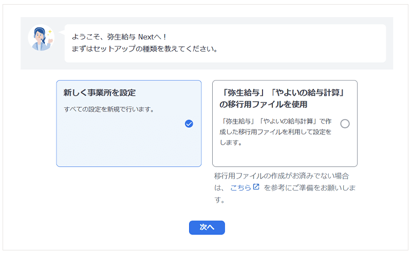 「弥生給与 Next」にはじめてログインすると、セットアップの種類選択画面が表示されます。