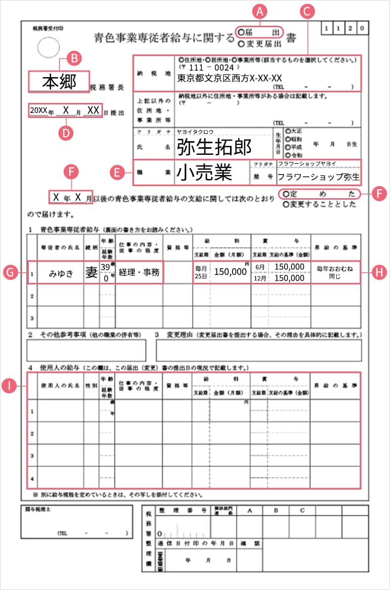 記載項目で特に気を付けたいのが、H欄にある給与額です。記載する金額はおおよその予定額でかまいません。また、実際に支払う給与が記入額より少なくなっても問題はありません。ただし、支払う額があまりに高すぎると不適正と判断されることがありますので注意しましょう。「家族ではなく、他人を雇ってその仕事を頼んだとしたらいくら支払うか」を基準に記入するようにしましょう。