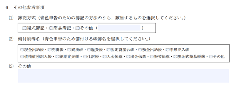 青色申告承認申請書の記入欄「6 その他参考事項(2)備付帳簿名(青色申告のため備付ける帳簿名を選択してください)」には、15項目が並んでいます。