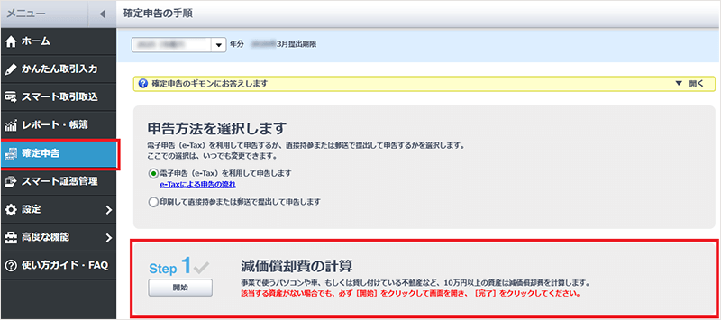 [Step1 減価償却費の計算]では、[固定資産の一覧]に登録した内容をもとに減価償却費の仕訳を自動作成します。