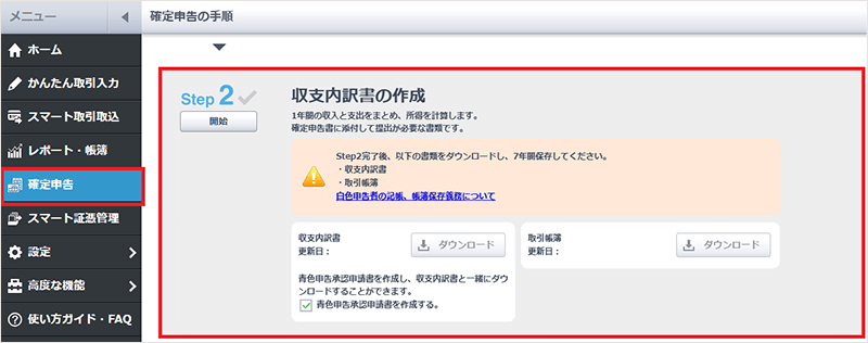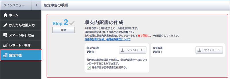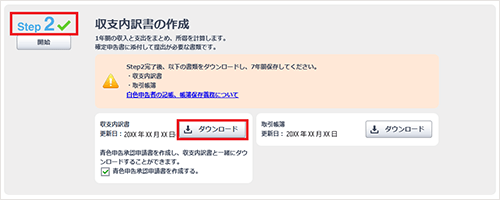 [Step2 収支内訳書の作成]では、入力した取引内容をもとに収支内訳書を作成します。