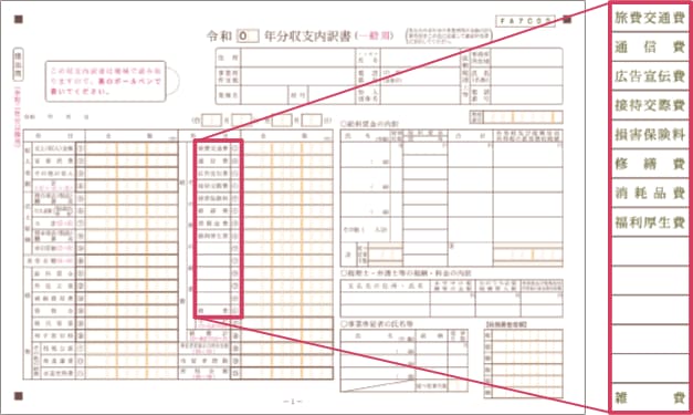 確定申告の際に使用する「収支内訳書」の一枚目、経費の欄に空欄が用意されていて、自分で作った科目(勘定科目)を記入できます。