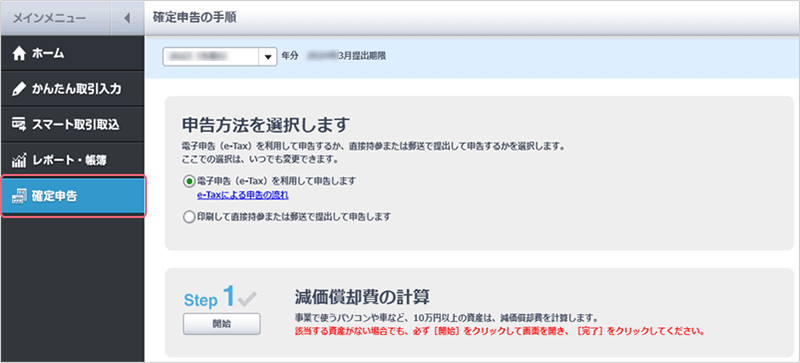 確定申告書類の作成と提出は、「確定申告の手順」で4つのStepを順に操作することで完了します。