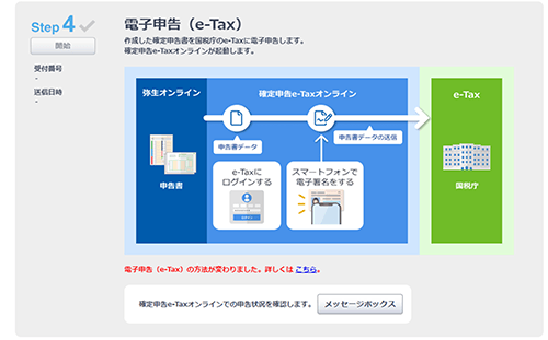 「Step4 電子申告(e-Tax)」では、作成した確定申告書類をe-Taxで税務署に送信します。