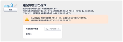 「Step3 確定申告書の作成」では、給与所得や公的年金などの事業以外の所得や、社会保険料や生命保険料、医療費、ふるさと納税などの寄附金、住宅ローン控除などの控除についての情報を入力し、確定申告書を作成します。