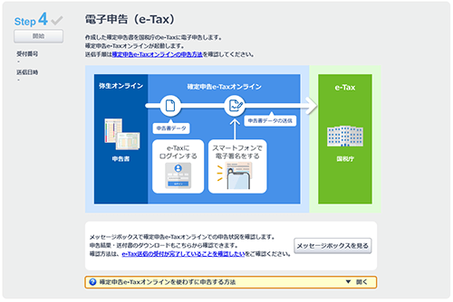 「Step4 電子申告(e-Tax)」では、作成した確定申告書類をe-Taxで税務署に送信します。