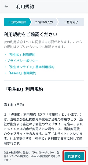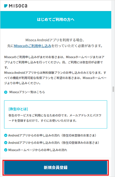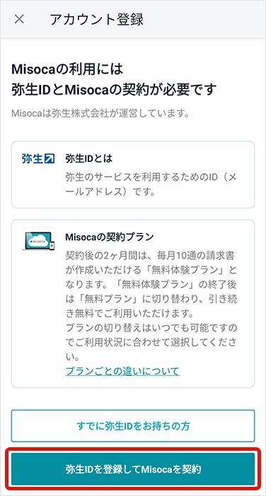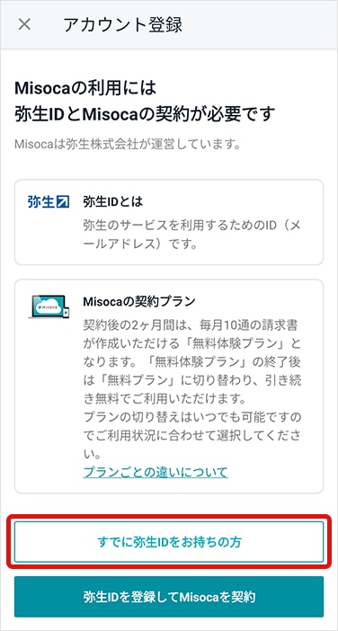 Misocaのご利用申し込みがまだのお客さまは、Misocaホームページまたはアプリよりご利用申し込みを行ってください。尚、ご利用には弥生IDが必要です。