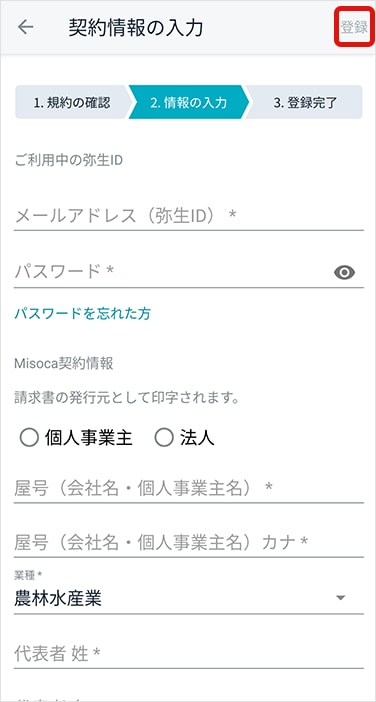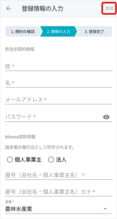 Misocaの登録に必要な情報を入力し「登録」をタップします。