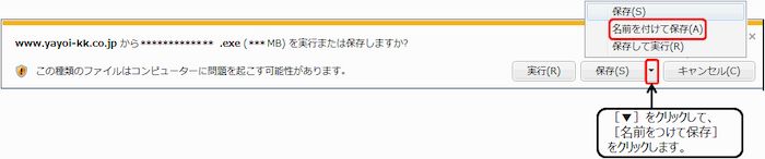 [名前を付けて保存]画面が表示されずに、直接「ダウンロード」フォルダーにプログラムが保存される場合があります。下記画面が表示される場合は、「保存」の[▼]をクリックし、[名前を付けて保存]をクリックします。