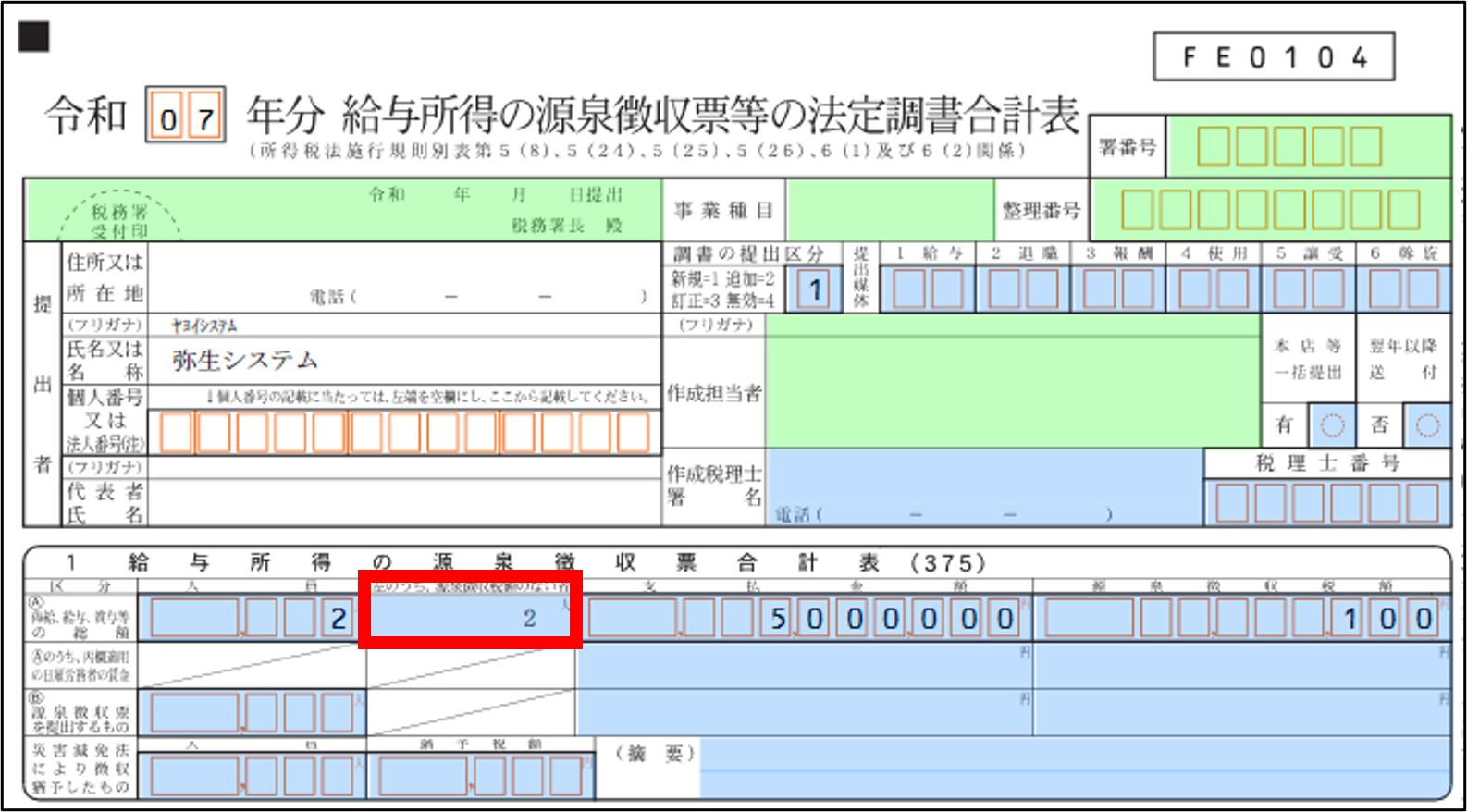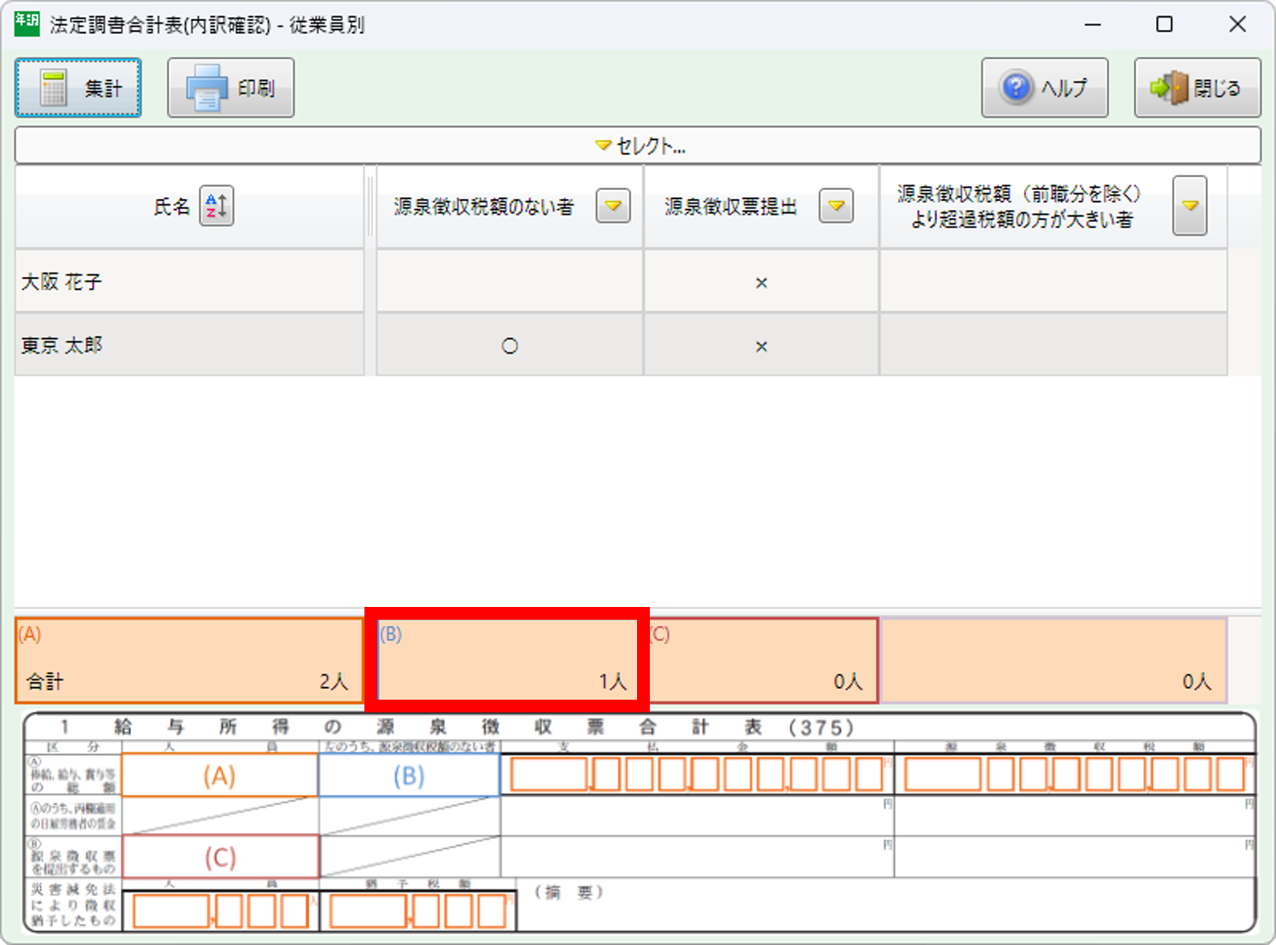 法定調書合計表の[左のうち、源泉徴収税額のない者]の人数を確認する