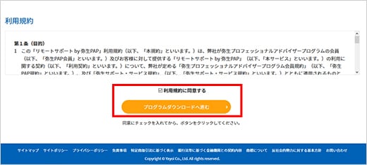 本ページの「リモートサポート by 弥生PAP 利用規約」に同意の上、「プログラムダウンロードへ進む」をクリックします。